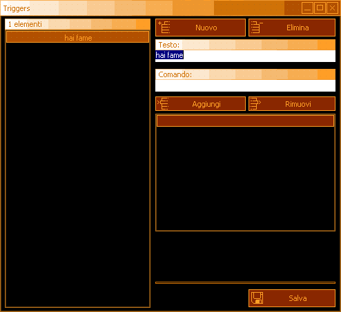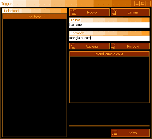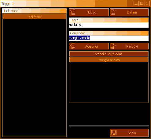 Appaiono in questo modo due voci vuote (una per lista), quella della lista di sinistra e' gia' selezionata, mentre quella di destra e' deselezionata. Il cursore e' posizionato sulla casella sotto a "Testo:", in questa casella dobbiamo inserire il testo a cui vogliamo che il client reagisca, inviando i comandi che definiremo piu' avanti. 4. Scriviamo "hai fame" e premiamo invio. Il testo viene trasportato nella voce selezionata della lista di sinistra. Ora che il testo e' settato non ci resta che impostare i comandi. 5. Per farlo selezioniamo l'unica voce della lista di destra (con un semplice click). Il cursore si spostera', dalla casella di testo in altro a quella in basso. Scriviamo "prendi arrosto cons", che corrisponde a prendere l'arrosto che vogliamo mangiare dall'anello conservatore, e premiamo invio. Com'era successo prima la scritta inserita si appare nella lista, sulla voce selezionata. Ora abbiamo preso l'arrosto, ma dobbiamo ancora impostare un comando per mangiarlo. 6. Per farlo deselezioniamo la voce selezionata nella lista di destra (cliccandoci di nuovo sopra), la casella di testo "Comando:" si svuota. 7. Spostiamoci col mouse sulla casella di testo e scriviamo l'azione che vogliamo aggiungere alla lista. In questo caso "mangia arrosto", per mangiare l'arrosto. 8. Ora abbiamo due possibilita' per aggiungere il comando alla lista: possiamo cliccare sul pulsante "Aggiungi", oppure premere semplicemente invio. In entrambi i casi si creera' una nuova voce (selezionata automaticamente) sotto a quella preesistente. Ora il nostro triggger e' definito, non ci resta che premere "Salva" per salvare le modifiche ed il gioco e' fatto.